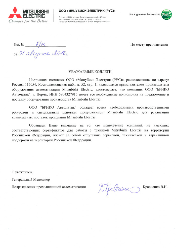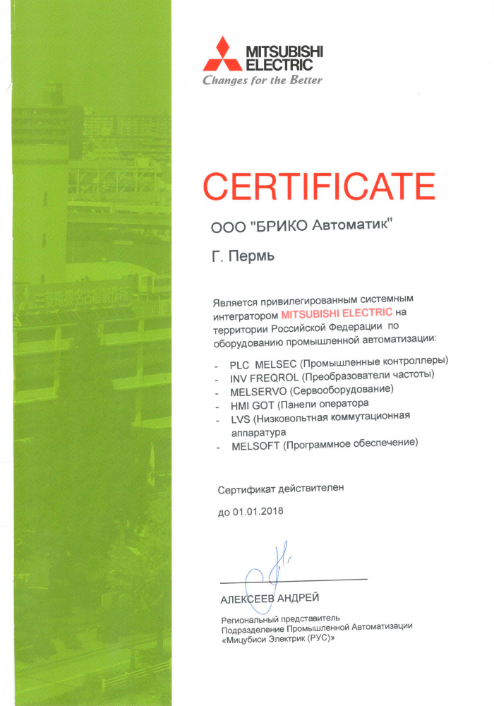- привилегированным системным интегратором японской компании MITSUBISHI Electric на территории Российской Федерации по оборудованию промышленной автоматизации (PLC MELSEC — Промышленные контроллеры; INV FREQROL — Преобразователи частоты; MELSERVO — сервооборудование; HMI GOT — панели оператора; LVS — низковольтная коммутационная аппаратура; MELSOFT — программное обеспечение)