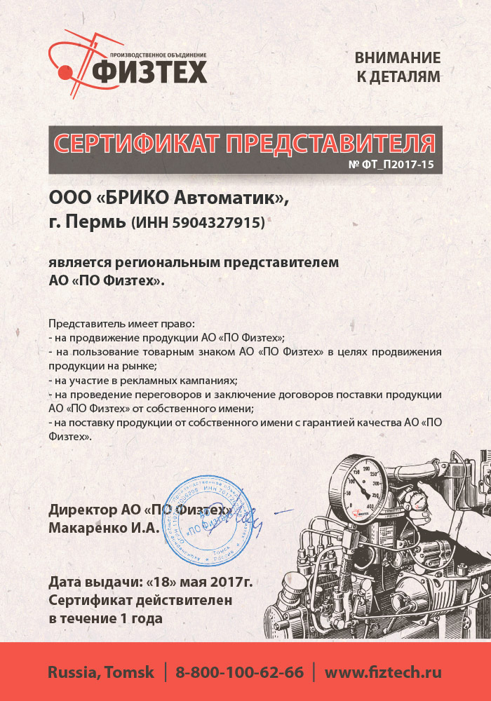 - представителем Производственного объединения ФИЗТЕХ, занимающейся производством технических, котловых, взрывозащищённых, электроконтактных (сигнализирующих), железнодорожных, аммиачных, коррозионностойких, судовых и виброустойчивых манометров класса точности 1,0, 1,5 и 2,5, а также манометров точных измерений класса точности 0,6 и 0,4
