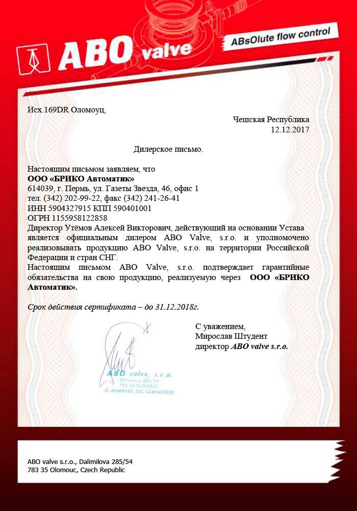 - официальным дилером ABO Valve (Чехия) — производителем высококачественных клапанов и затворов промышленного назначения