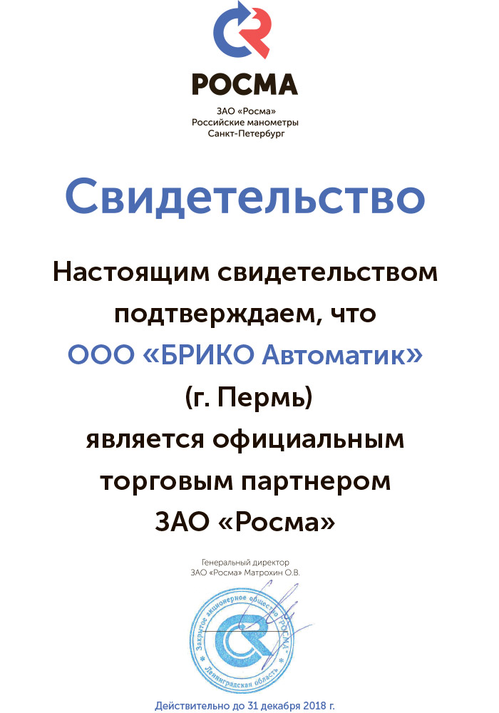 - «официальным дилером завода РОСМА (Санкт-Петербург) — производителя манометров, напоромеров, термометров, термоманометров, вакууметров, реле-давления, клапанов электромагнитных».