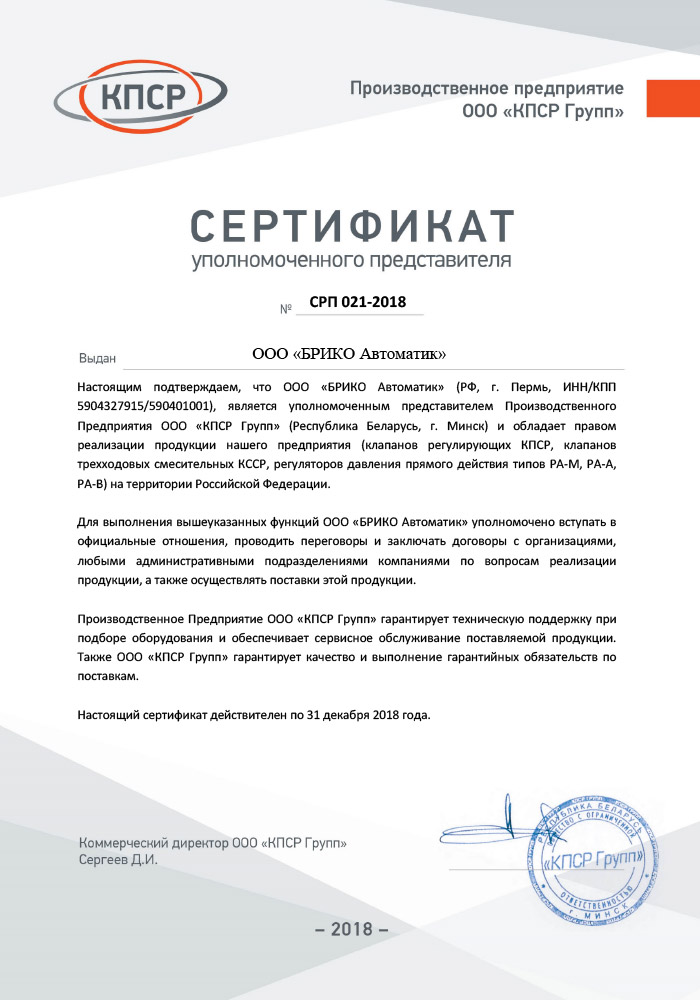 - уполномоченным представителем «КПСР Групп» — производителя клапанов запорно-регулирующих для воды, водяного пара, насыщенного пара, раствора этиленгликоля, и др. жидкостей; регуляторов давления прямого действия, теплообменного оборудования. Клапаны расчитаны на температуру до 425°С и давление до 40 атм.
