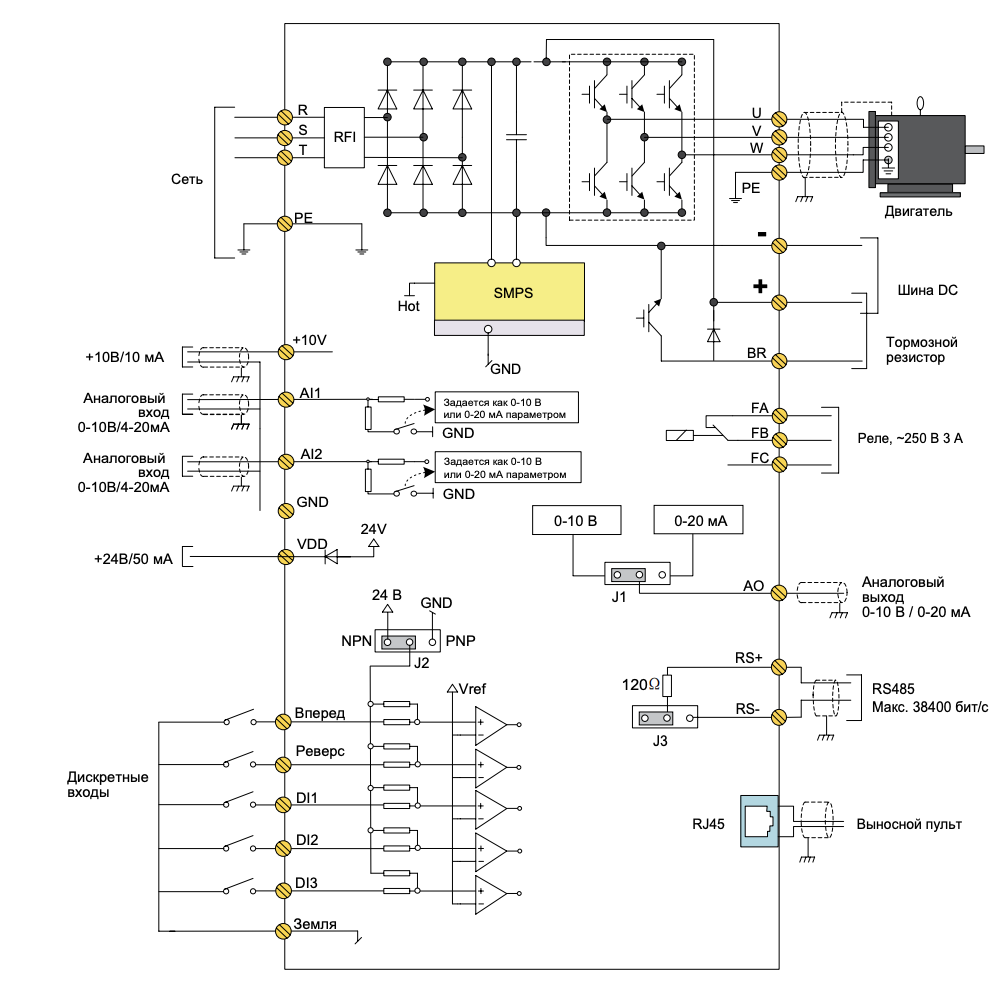 Функции управления | Многоступенчатое управление скоростью с помощью клемм управления или функции ПЛК, S-образные кривые разгона/замедления, управление механическим тормозом, счетчик, ПИД-регулятор, толчковый режим (JOG) и т. д. | |