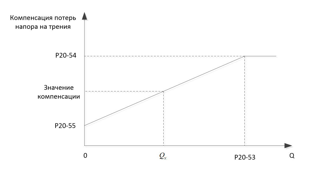 Эта функция позволяет компенсировать потери напора путем изменения заданного значения давления. Это помогает поддерживать постоянное давление в точке разбора независимо от требуемого расхода, если датчик давления установлен вблизи насоса. Для работы данной функции необходима установка датчика расхода (расходомера). Взаимосвязь между расходом и соответствующим значением компенсации показана на рисунке ниже: