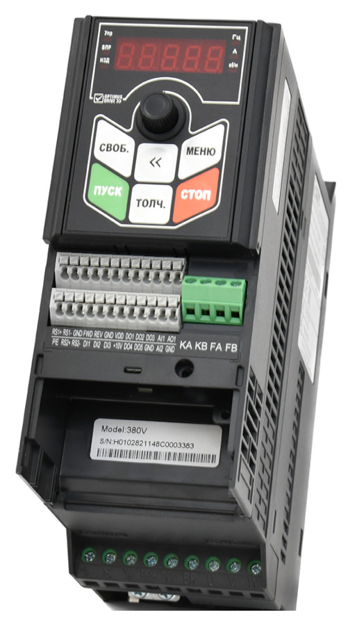 - Два встроенных RS485 / Modbus: один для связи с контроллером верхнего уровня и один для связи с другими преобразователями частоты при каскадном режиме