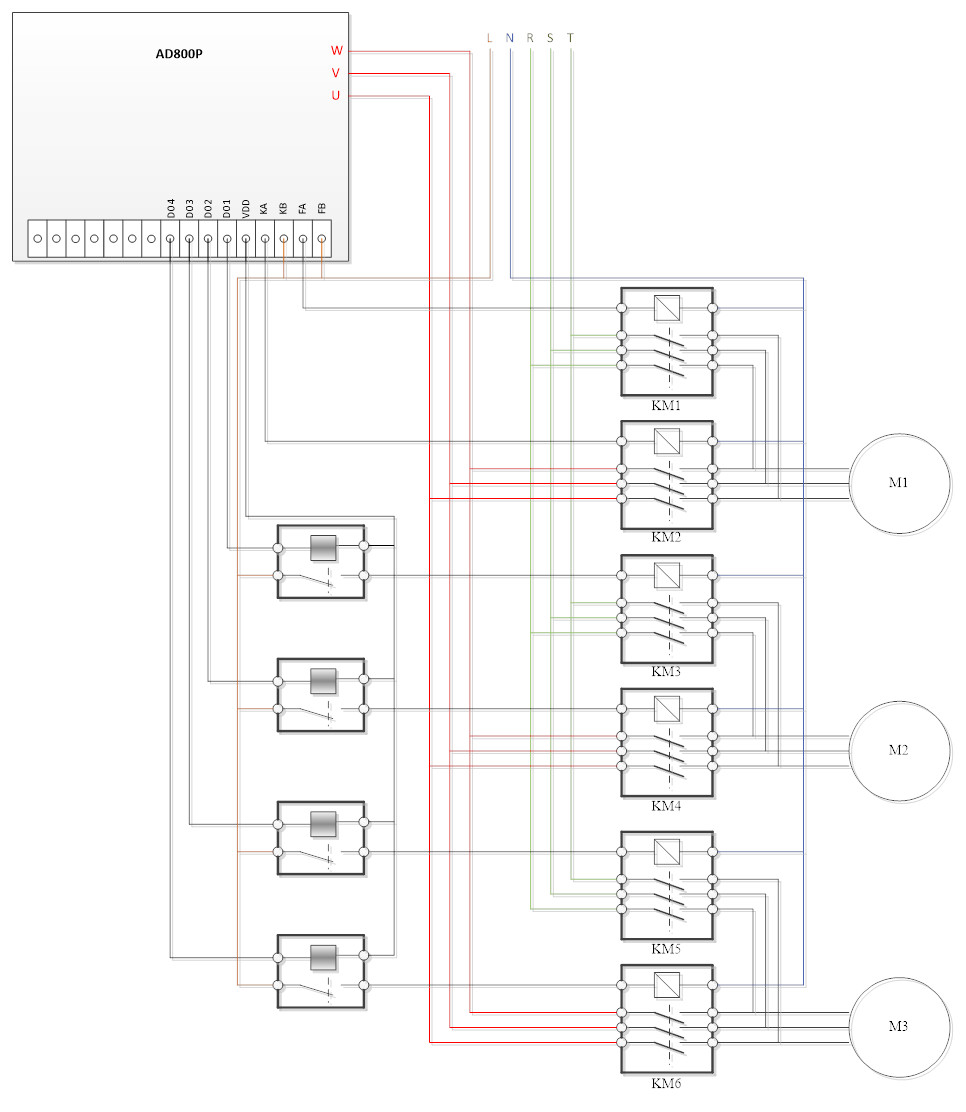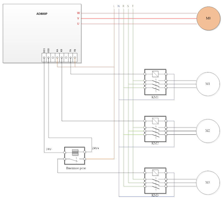 В этом режиме управления преобразователь частоты для поддержания давления или расхода может управлять до 7 дополнительными двигателями. ПЧ для поддержания давления (расхода) напрямую управляет двигателем 0 (M0) с использованием ПИД-регулятора, и по мере необходимости последовательно подключает(отключает) остальные двигатели к сети через контакторы. Схема подключения: