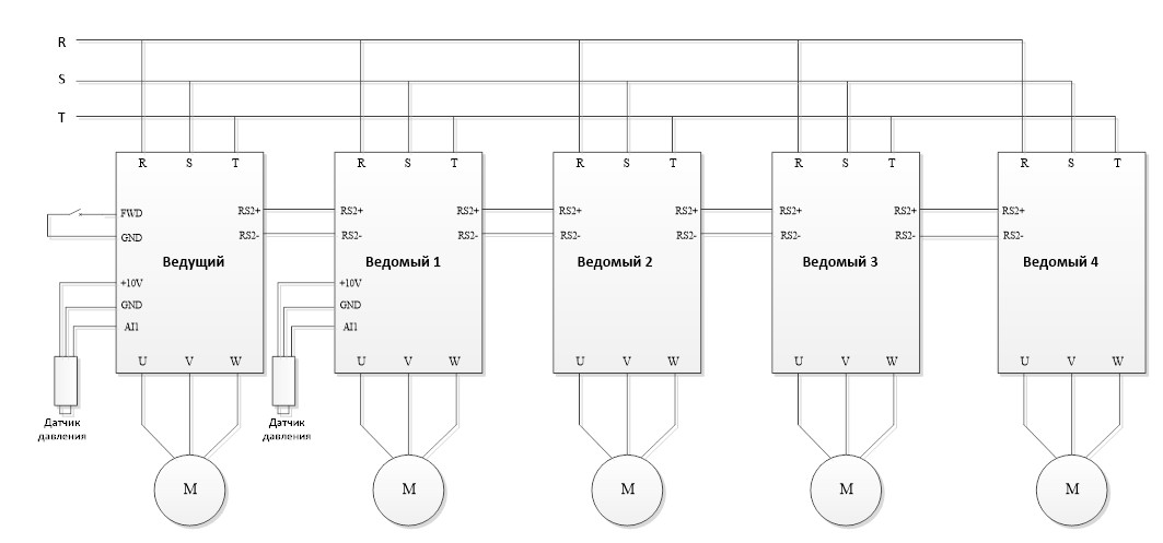 - Каскадное управление насосами с использованием нескольких преобразователей частоты, связанных по сети RS-485