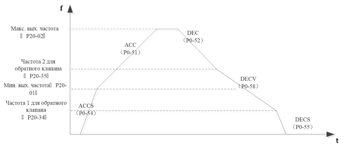 Для предотвращения колебаний давления в системе, которые могут вызывать нестабильность в работе обратного клапана предусмотрена специальная рампа разгона и замедления, см. рис. ниже: