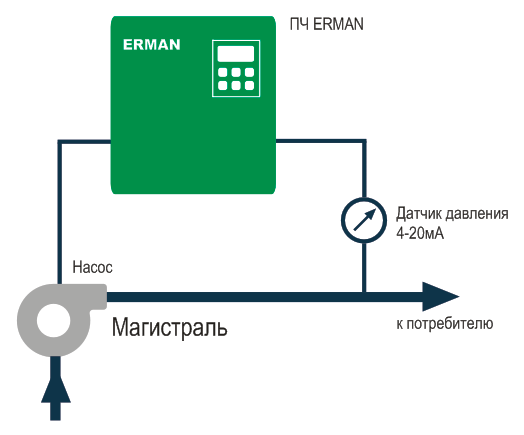Пример использования АДМ-100.3 для регулирования давления в системе водоснабжения.