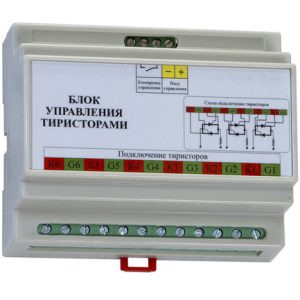 Печатная плата со схемой управления симистором установлена в пластиковом корпусе, предназначенном для крепления на DIN-рейку. Блок работает таким образом, что симистор открывается в момент, когда напряжение на них близко к нулю. Поэтому прибор создает минимальные помехи в сети.