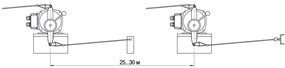 Трос диаметром 5 мм продевается в проушины и закрепляется зажимами. При длине троса более 15 метров следует устанавливать поддерживающие опоры через каждые 3 метра, а при длине троса в 25 метров – через каждый метр. Монтажное основание изготавливается заказчиком самостоятельно. Трос и зажимы в комплект поставки не входят.
