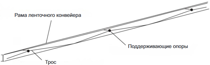 Длина троса подбирается таким образом, чтобы рычаг управления находился в вертикальном или близком к вертикальному положении. Натяжение троса обеспечивается действием пружины. При необходимости остановки конвейера оператор воздействует на трос, который в свою очередь тянет рычаг управления, отклоняя его от вертикального положения. При достижении угла 30° происходит фиксация рычага управления.