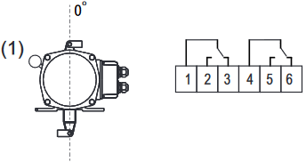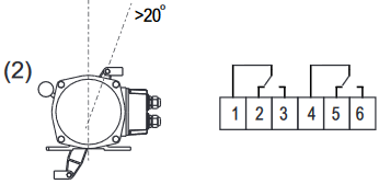 2. При отклонении рычага на угол 20° или больше, на первом микровыключателе размыкаются контакты 1 и 3 и замыкаются контакты 1 и 2, на втором микровыключателе размыкаются контакты 4 и 6 и замыкаются контакты 4 и 5. |