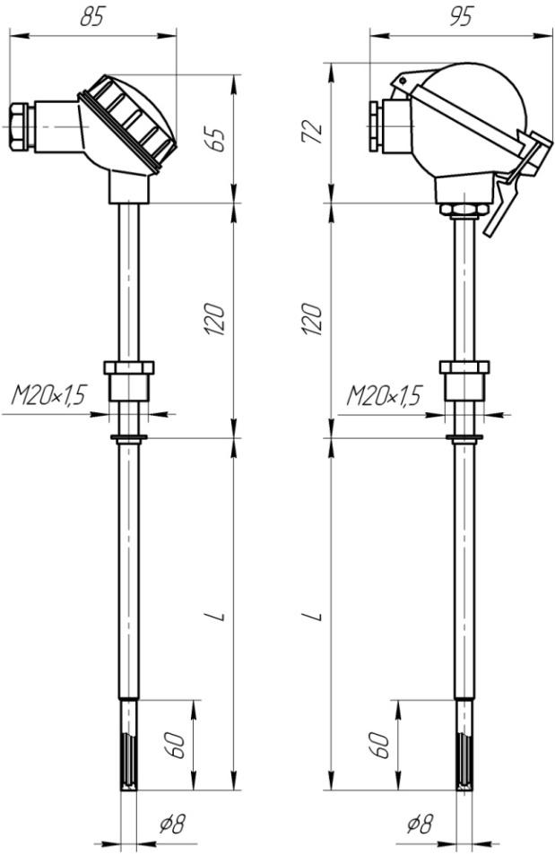 • ТХА-К/ТХК-К/ТЖК/ТНН.110: защитная арматура  с подвижным штуцером М20×1,5, с утонением в зоне измерения; материал клеммной головки – фенопласт.