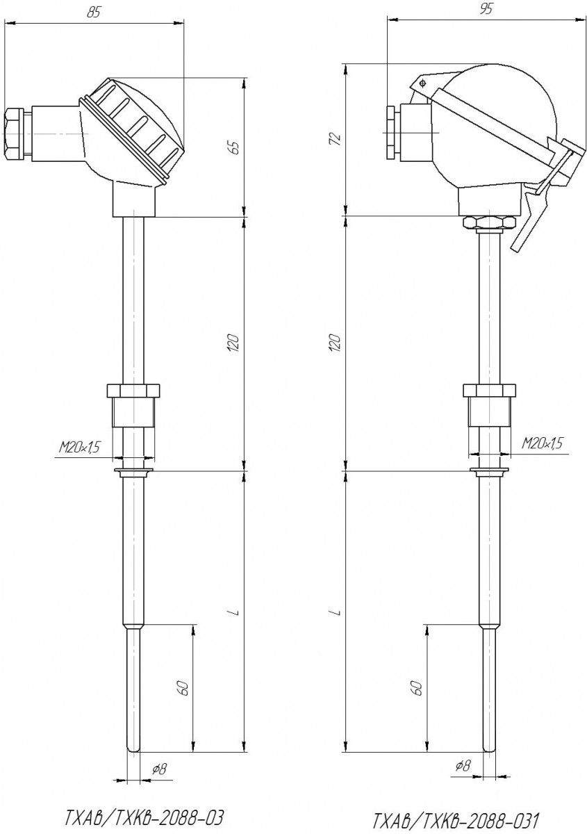 - ТХАв/ТХКв-2088-03: защитная арматура со штуцером М20×1,5 с утонением в зоне измерения; материал клеммной головки – фенопласт;