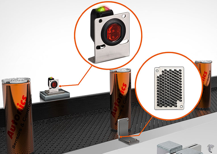 Фронтальные / боковые фотоэлектрические датчики используются для обнаружения алюминиевых банок в линиях упаковки напитков.