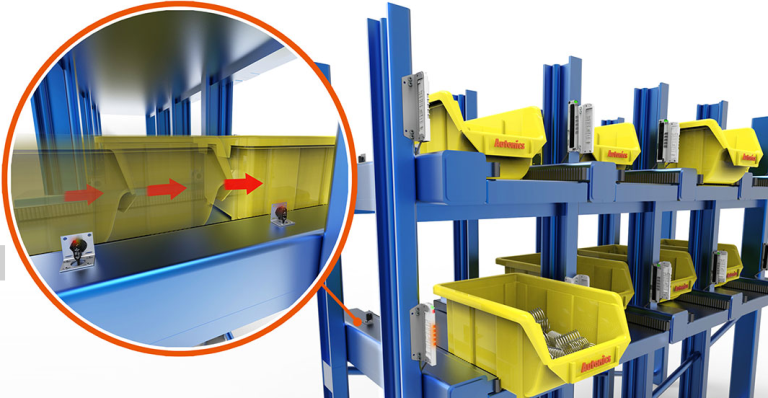 Фотоэлектрические датчики фронтального / бокового монтажа используются на складских стойках для обнаружения входа и выхода лотков.