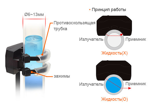 - Определение присутствия жидкости в прозрачных трубах (с внешним диаметром от 6 до 13мм, толщиной стенки < 1мм)