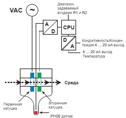 Измерительный модуль изготовлен из ПЭЭК. Через отверстие в корпусе модуля протекает среда. Вокруг отверстия смонтированы две катушки. На первичную катушку подается переменное напряжение, а вторичная катушка получает электрический импульс через среду и генерирует напряжение. Величина этого напряжения зависит от проводимости среды. Этот сигнал усиливается и преобразуется в линейный аналоговый 4…20 мА выходной сигнал. Также в наконечник корпуса встроен датчик Pt100. Он измеряет температуру среды и эти показания используются для температурной компенсации сигнала проводимости, который зависит от температуры. Измеряемая величина с датчика Pt100 выдается в виде аналогового выходного сигнала 4…20 мА. Катушки и датчик встроены в корпус из ПЭЭК, с шероховатостью поверхности (Ra) <0,8 мкм., вследствии чего могут применяться для гигиенических процессов или для использования в концентрированных кислотах и щелочах.