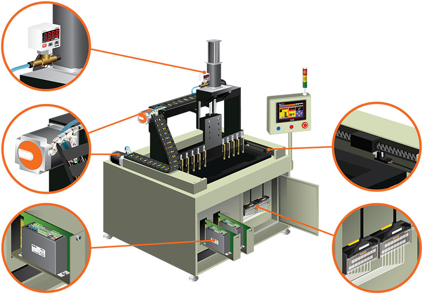 Датчики давления, 5-фазные шаговые двигатели и двигатели, фотомикро-датчики, интерфейсные клеммные блоки и логические панели используются в процессе контроля ЖК-дисплеев, используемых в мобильных электронных устройствах.