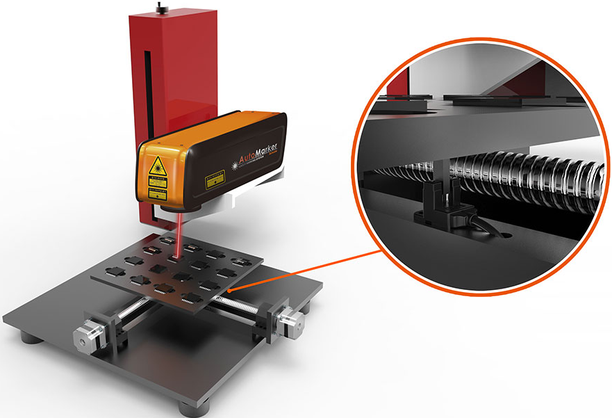 Датчики Photomicro и шаговые двигатели используются для перемещения и проверки расположения осей X-Y лотков при лазерной маркировке полупроводниковых деталей.