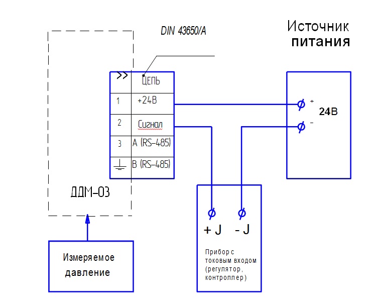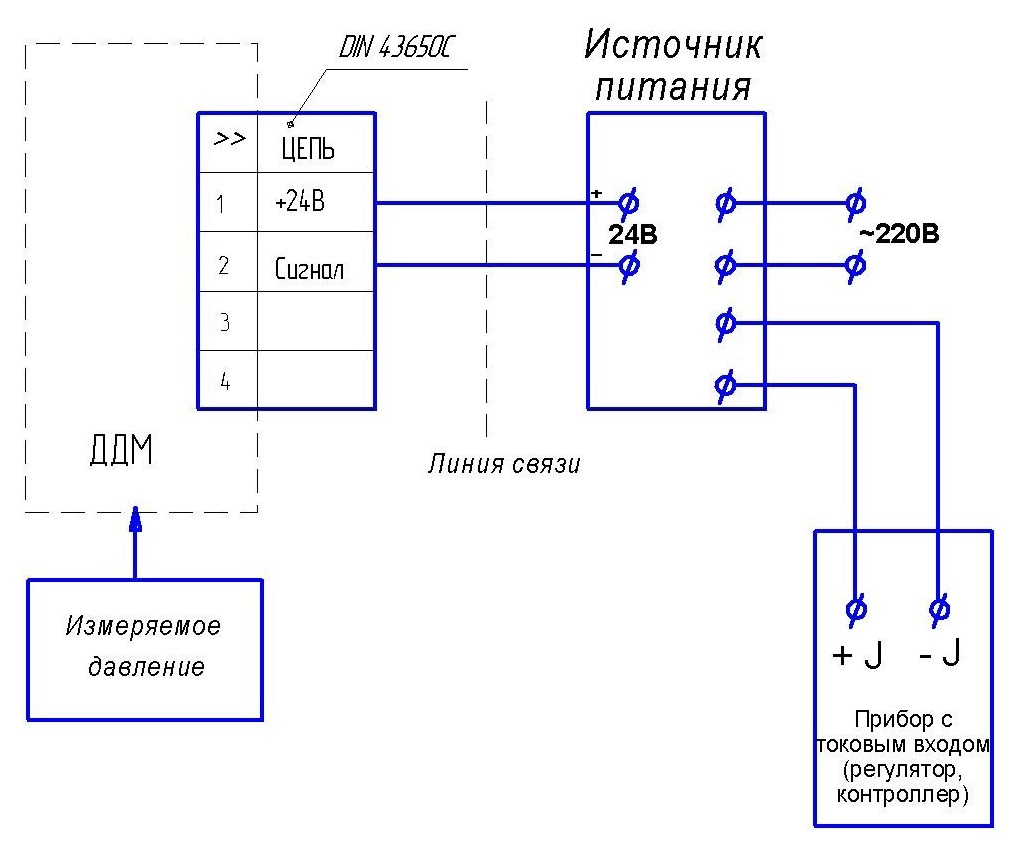 Схема подключения датчика ДДМ-03 общепромышленного исполнения на объекте Схема подключения датчика ДДМ-03-Ех на объекте с применением взрыво-защищенного источника питания