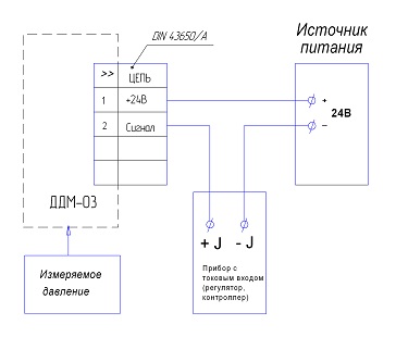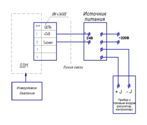 Схема подключения датчика ДДМ-03-МИ общепромышленного исполнения на объекте Схема подключения датчика ДДМ-03-МИ-Ех на объекте с применением взрывозащищенного источника питания