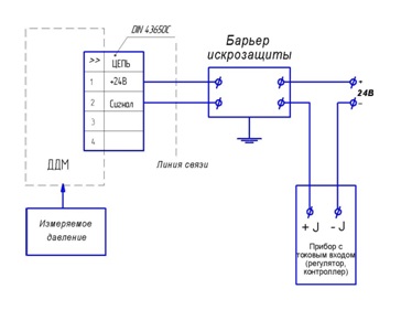 Схема подключения датчика ДДМ-03-МИ-Ех на объекте с применением барьера искрозащиты