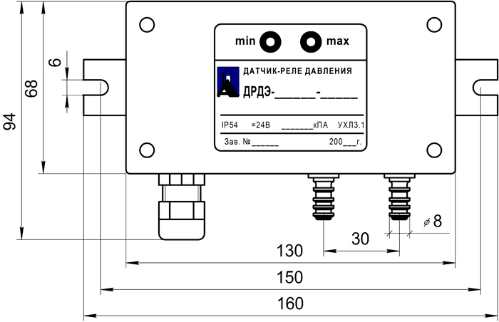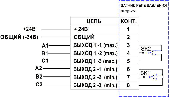 Выходной сигнал – две пары переключающихся «сухих» контактов электромагнитного реле. Одна пара срабатывает при достижении верхнего предела давления, другая пара – при достижении нижнего предела давления.
