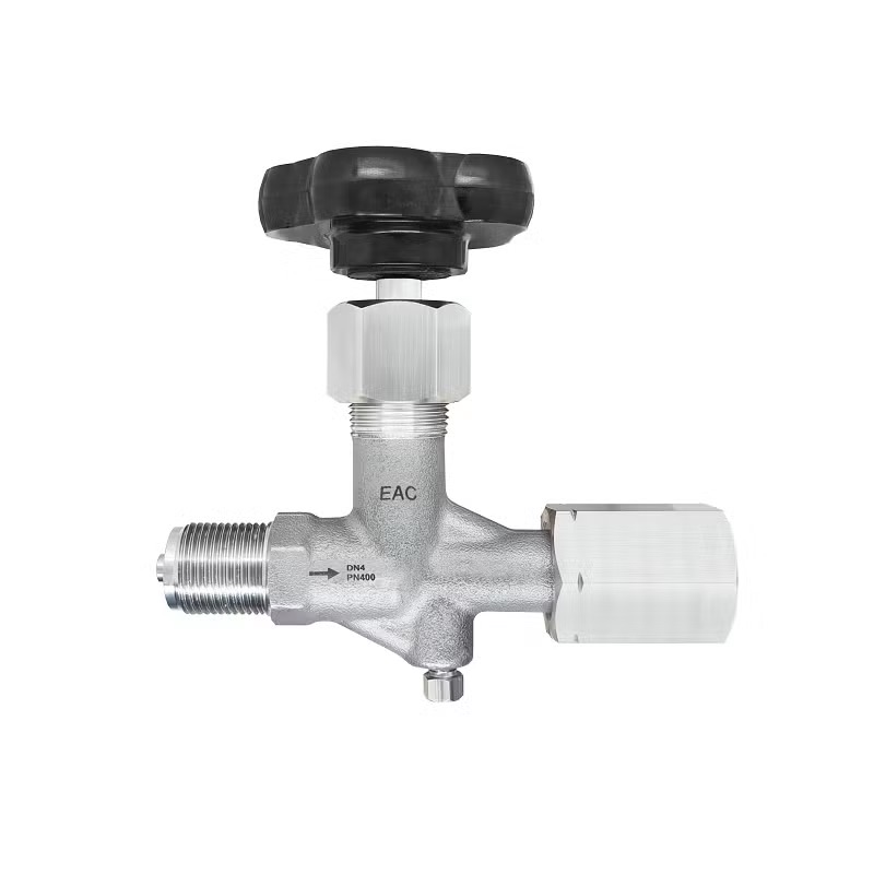 Клапан оснащен винтом для сброса давления, который позволяет осуществлять демонтаж и замену СИ (средство измерения) без остановки линии. Тестовый порт с заглушкой позволяет осуществить подключение контрольного манометра к системе без остановки технологического процесса.