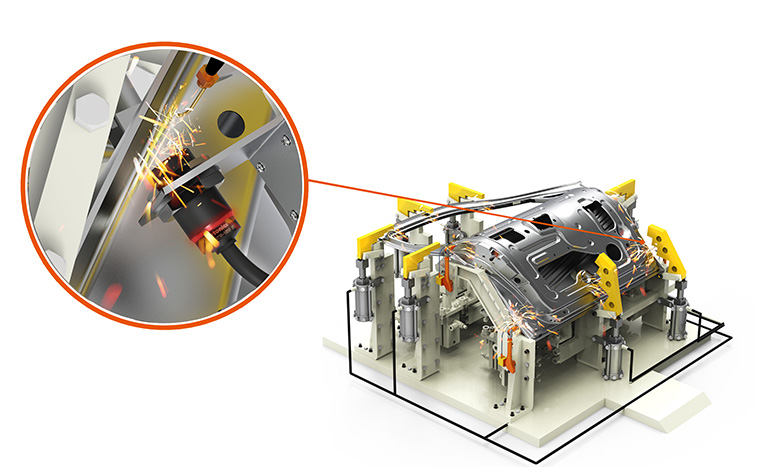 Полнодиапазонные индуктивные датчики приближения используются для определения местоположения автомобильных дверей во время точечной сварки.