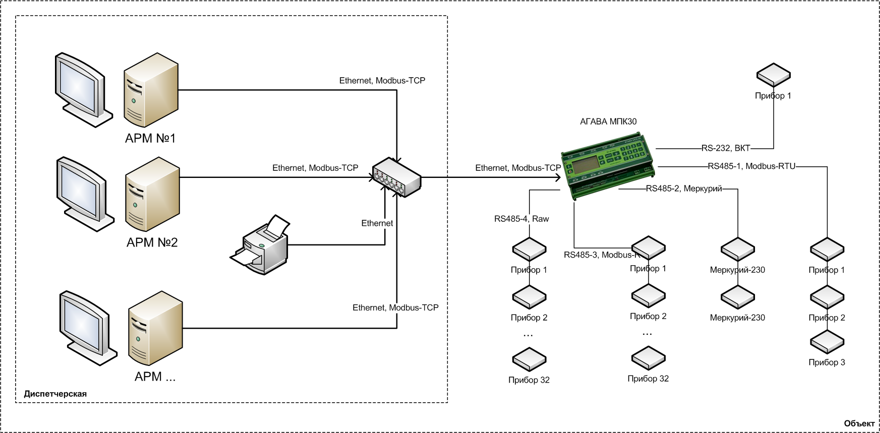 Интеллектуальный шлюз протоколов АГАВА МПК30, построенный на базе контроллера АГАВА 6432.30 ПК предназначен для подключения устройств с различными протоколами передачи к системам диспетчеризации, в том числе распределенным. Прибор является усовершенствованным аналогом устройств типа Moxa MGate MB3170 и Moxa NPort 5150.