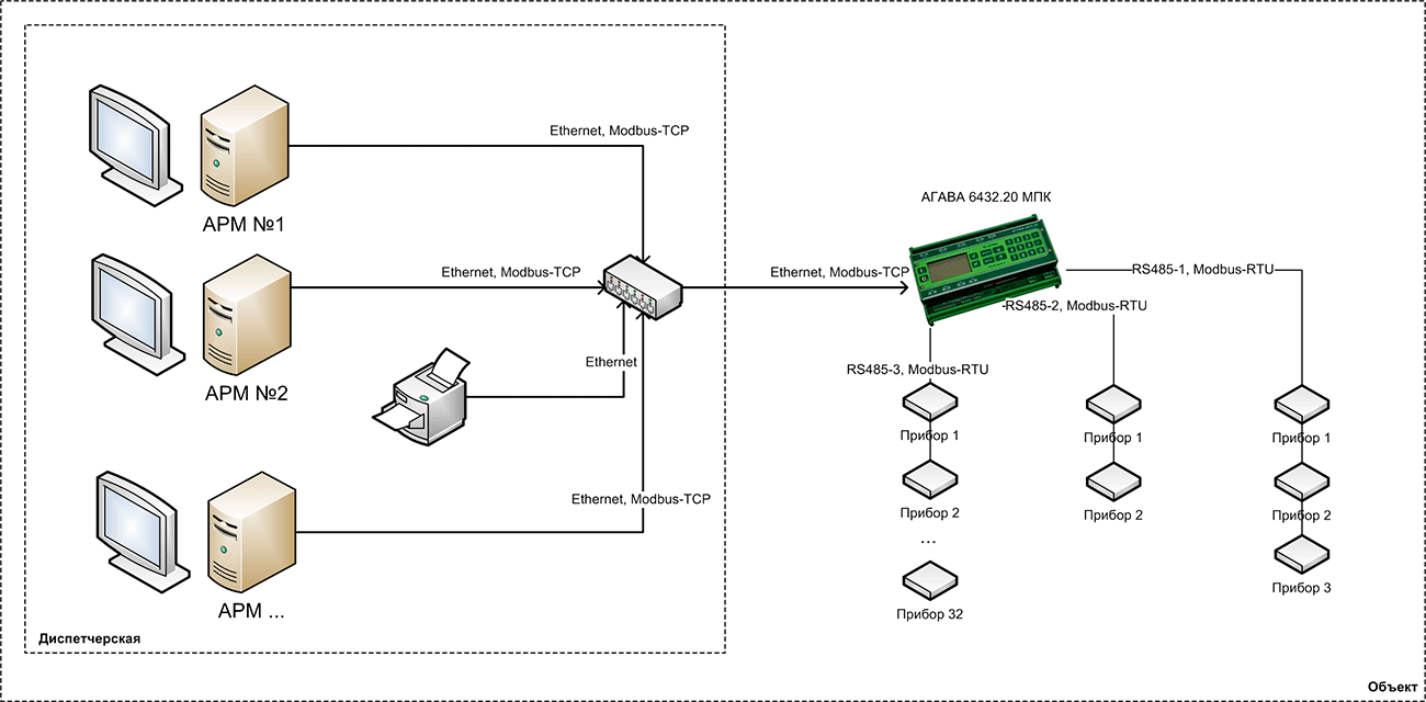 Интеллектуальный шлюз протоколов Modbus-TCP/Modbus-RTU, построенный на базе контроллера АГАВА 6432.20 ПК предназначен для подключения устройств с протоколом передачи modbus-RTU к системам диспетчеризации, в том числе распределенным. Прибор является усовершенствованным аналогом устройств типа Moxa MGate MB3170.