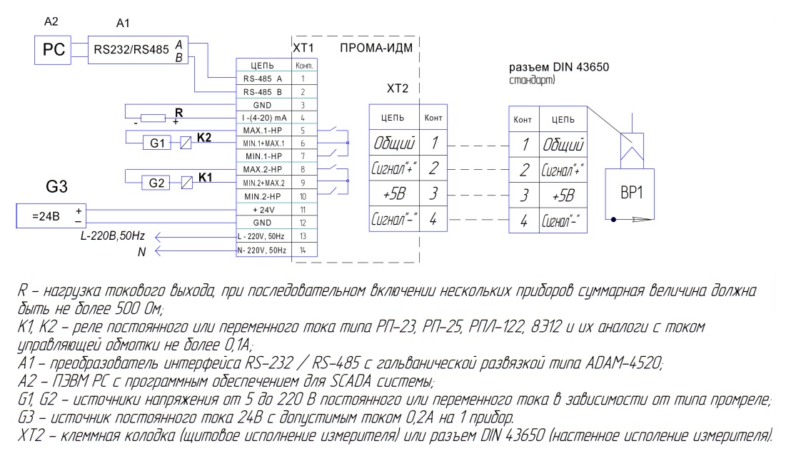 Измеритель ПРОМА-ИДМ(В). Схема внешних соединений и назначение контактов клеммной колодки ХТ1 и ХТ2 |