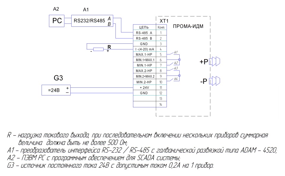 Измеритель ПРОМА-ИДМ(В). Схема внешних соединений и назначение контактов клеммной колодки ХТ1 и ХТ2 |
