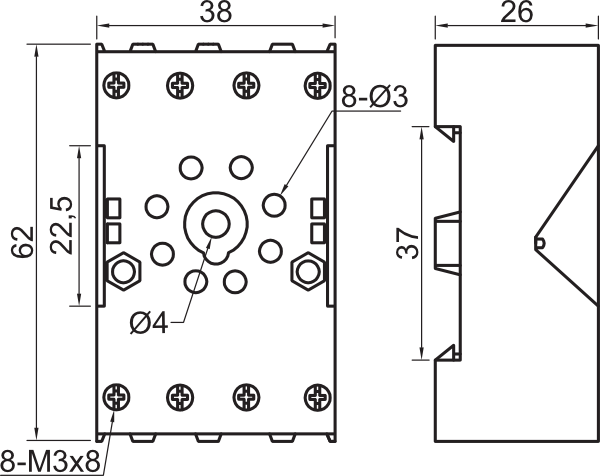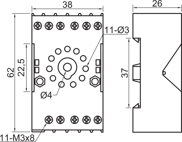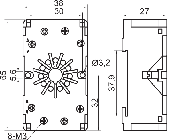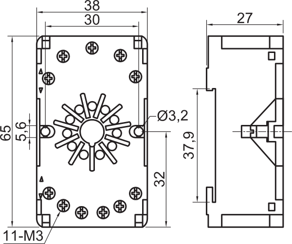 - Предназначены для установки на DIN-рейку или плоскость 2-контактных (8-ми штырьковых) и 3-контактных (11-штырьковых) промежуточных реле и реле времени различных производителей