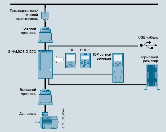 SINAMICS G120C может управлять асинхронными двигателями в диапазоне мощностей от 0,37 до 18,5 кВт. Надежная и эффективная работа двигателя достигается за счет применения самой современной технологии IGBT в комбинации с модернизированным векторным управлением. Кроме этого, интегрированные в SINAMICS G120C обширные защитные функции предлагают надежную защиту для преобразователя и двигателя.