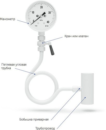 При измерении давления среды с температурой, превышающей допускаемую рабочую температуру, необходимо устанавливать перед прибором петлевую трубку. Также петлевая трубка может устанавливаться для защиты манометра от воздействия пульсаций измеряемой среды и уменьшения влияния температуры среды на точность показаний манометра.