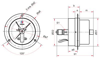 Тип ТМ (ТВ, ТМВ), серия 10. Манометры с электроконтактной приставкой предназначены для управления внешними электрическими цепями в схемах сигнализации, автоматики и блокировки технологических процессов.