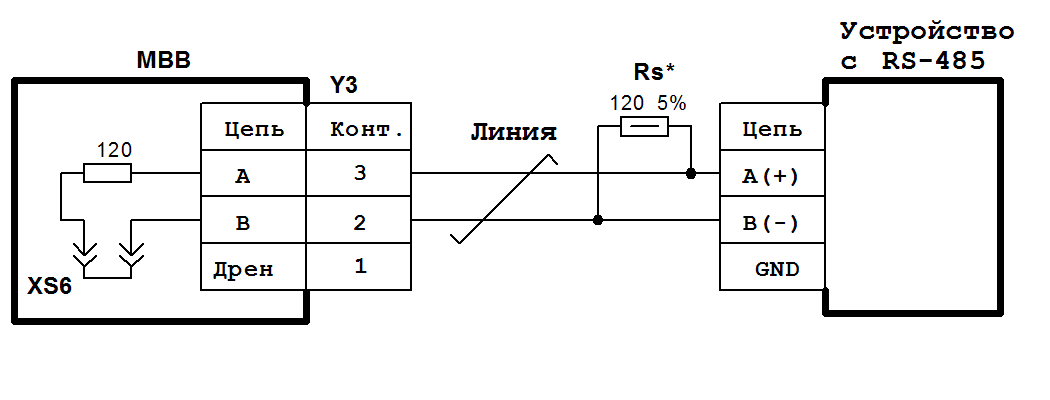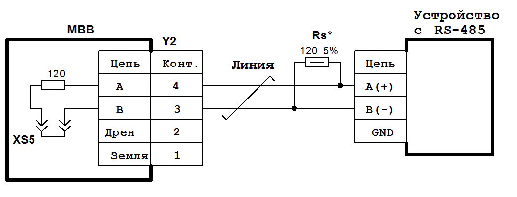 - Схема подключения устройств с RS-485 к каналу 2 (Y3) (без дренажного провода)
