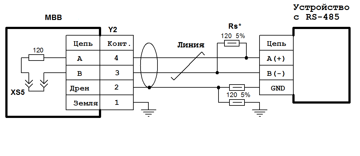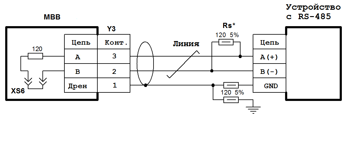 - Схема подключения устройств с RS-485 к каналу 2 (Y3) (с дренажным проводом)