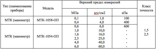 Типы, верхние пределы измерений и модели МТК-ОП