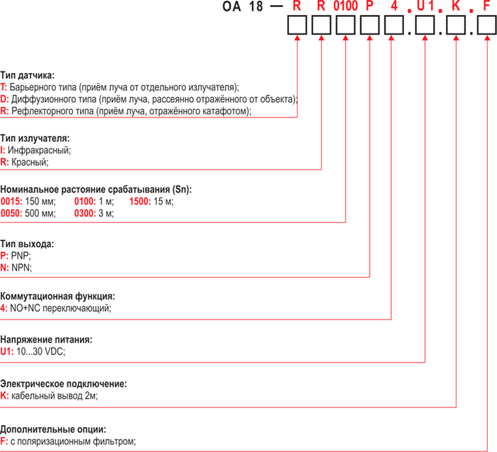 Структура условного обозначения при заказе оптических датчиков OA18: