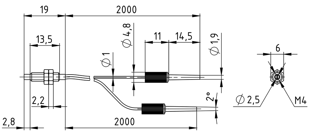 Вы заказали: Оптоволоконный кабель с установленной головкой с резьбой М6, диффузным типом детектирования, с номинальным расстоянием срабатывания 65 мм, длина кабеля 2 метра.
