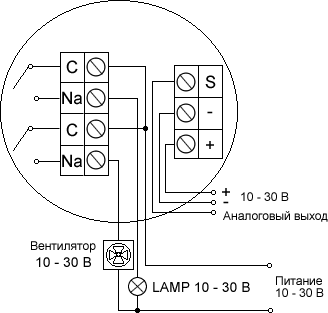 Электрическая схема подключения порогового датчика газа WPD на CO с аналоговым и релейным выходами
