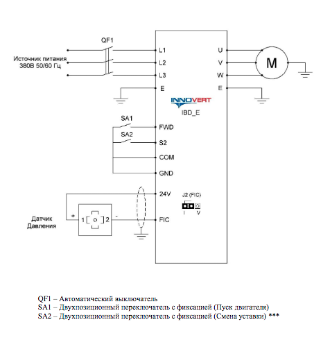 2. PC.00 = 25.0 — Предустановленное задание 0 (%) аналогично 2.5 бар 3. PC.01 = 35.0 — Предустановленное задание 1 (%) аналогично 3.5 бар (Переключение заданий давления происходит за счет замыкания переключателя SA2)