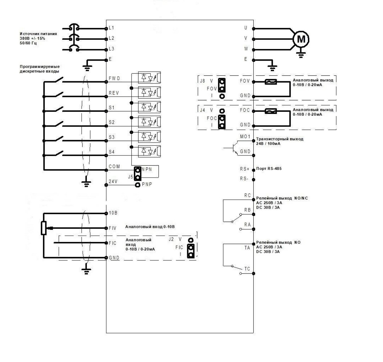 Два канала задания частоты. Задание частоты аналоговыми сигналами 0~10В, 4~20мA, ПИД-режим, режим ПЛК, с помощью протокола связи RS485 и настройка с помощью электронного потенциометра МОР (UP/DOWN). |