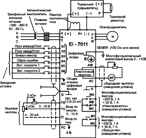 Тормозной прерыватель Встроенный (для моделей 001Н — 020Н). Внешний (для моделей 025Н — 400Н)