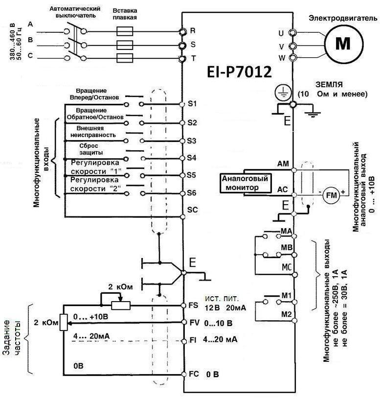 Аналоговый вход задания частоты 0…+10 В (20 кОм), 4…20 мА (250 Ом)