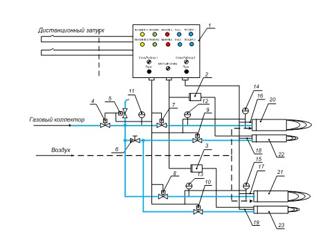 Комплексная система дистанционного розжига и автоматического контроля наличия пламени, для оснащения горелочных устройств в промышленных печах нефтехимических и нефтеперерабатывающих производств. Особенностью системы является двойное резервирование контроля пламени пилотной горелки – одновременный контроль фотодатчиком и ионизационным датчиком.