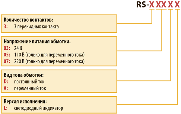 RS-305AL | силовое, 110VAC, 3-конт., 10А/250VAC, мех. индикатор, LED-индикатор |